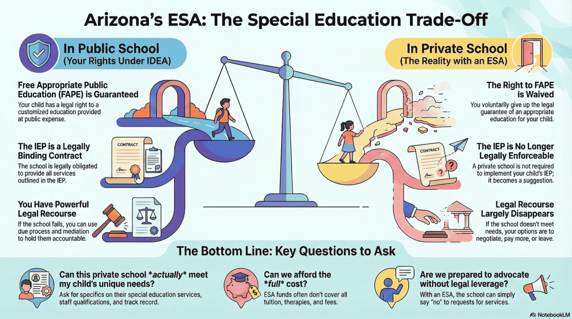I’m not saying the ESA is never the right choice. For some families, it absolutely is. But I’ve worked with too many parents who made this decision without fully understanding the trade-off, and by the time they realized what they’d lost, their child was struggling in a private school with no legal recourse to get help.